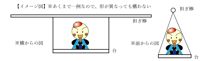 ・競技中破損することなく、スタート地点からゴール地点までもーりー人形(幅70cm、厚み60cm、高さ100cm、重さ約15kg)を安全に運べること